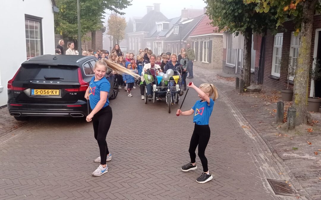 Vanmorgen haalden Lisa en Annyck met een majoretteshow juf Albertha van huis. In een feestelijke optocht gingen ze naar school om het 40-jarig jubileum van de Eastermarder juf te vieren!